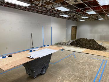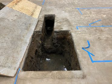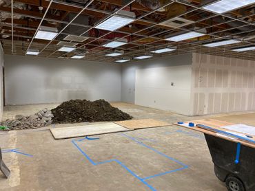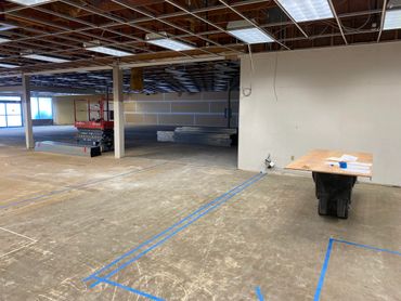 Since the demolition removed all the floor cover, the markings for our layout were also removed. They were nice enough to go back and re-tape the layout for us. We also found out the area that was dug up was in fact due to the locating of pluming and also to make way for our grease trap. Pretty exciting stuff..