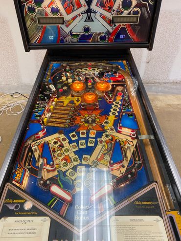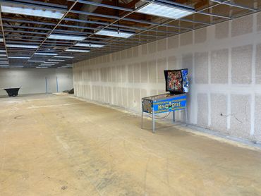 04/16/23 - Today we took a game over to our location to see what kind of glare we would get on the glass underneath the current lighting. We placed the game in different spots along the wall to see how much reflection we would get. First, we placed the game in between two sets of lights. As you can see from the first picture the game was picking up significant glare in the center of the playfield. When we moved the game down a couple of feet closer to one of the lights, we got major glare as seen in the second picture. We determined that the sample 2' x 4' LED panel light even on the lowest brightness setting was not going to be dark enough. We think smaller 2' x 2' LED panel lights moved further away from the walls and on a dimmer switch will ensure our guests get the best possible gaming experience with little to no glare.