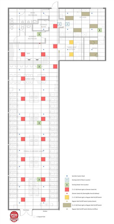 04/21/23 - Had a call with the contractor today to discuss the results of our test. We are definitely moving towards 2' x 2' LED panel lights on a dimmer switch over the gaming/bar area and hallway. This will enable us to work around the sprinkler system heads and move the lighting away from the pinball machines on each wall. We also eliminated lighting down the middle over the arcade games. We will maintain enough even lighting that you will still be able to see your ball and have a pleasurable gaming experience. Our proposed lighting layout is below..